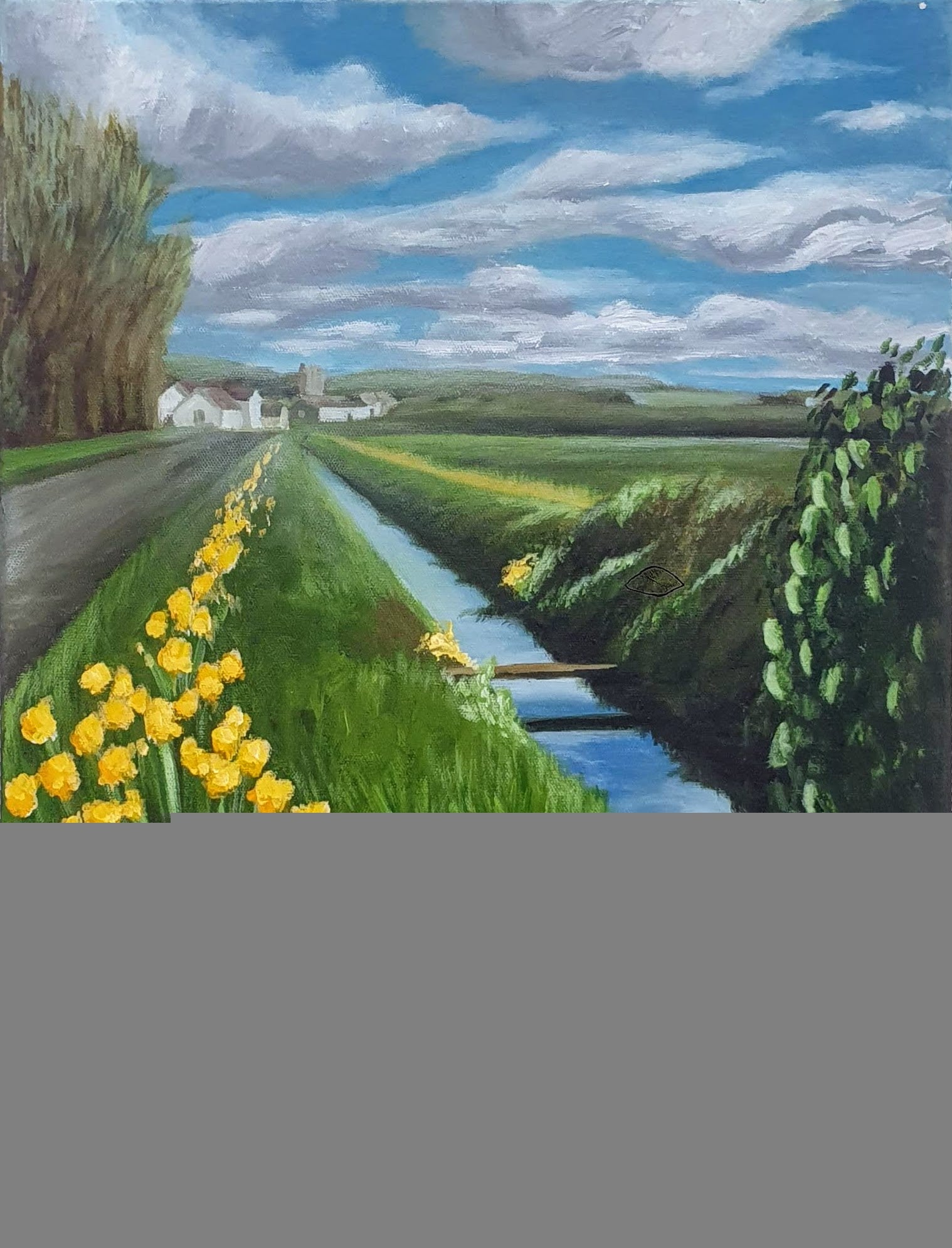 A very local scene, this painting captures the essence of springtime in the artist's home village in Somerset. A typical British day mixing blue sky with looming clouds. We see the bright reflections on the water in the rhyme, contrasting with the bold yellow daffodils growing along the edge of Bleadon Road.