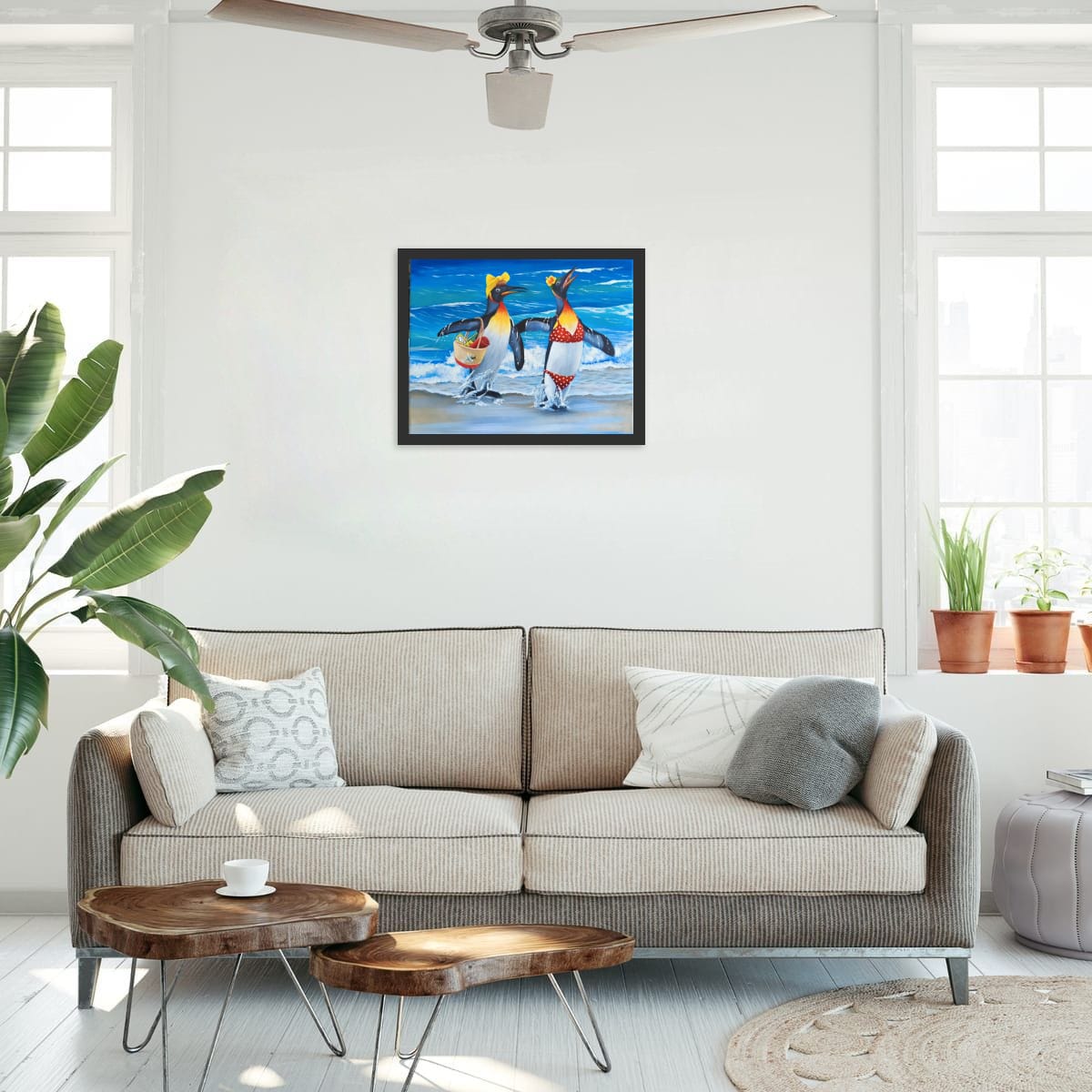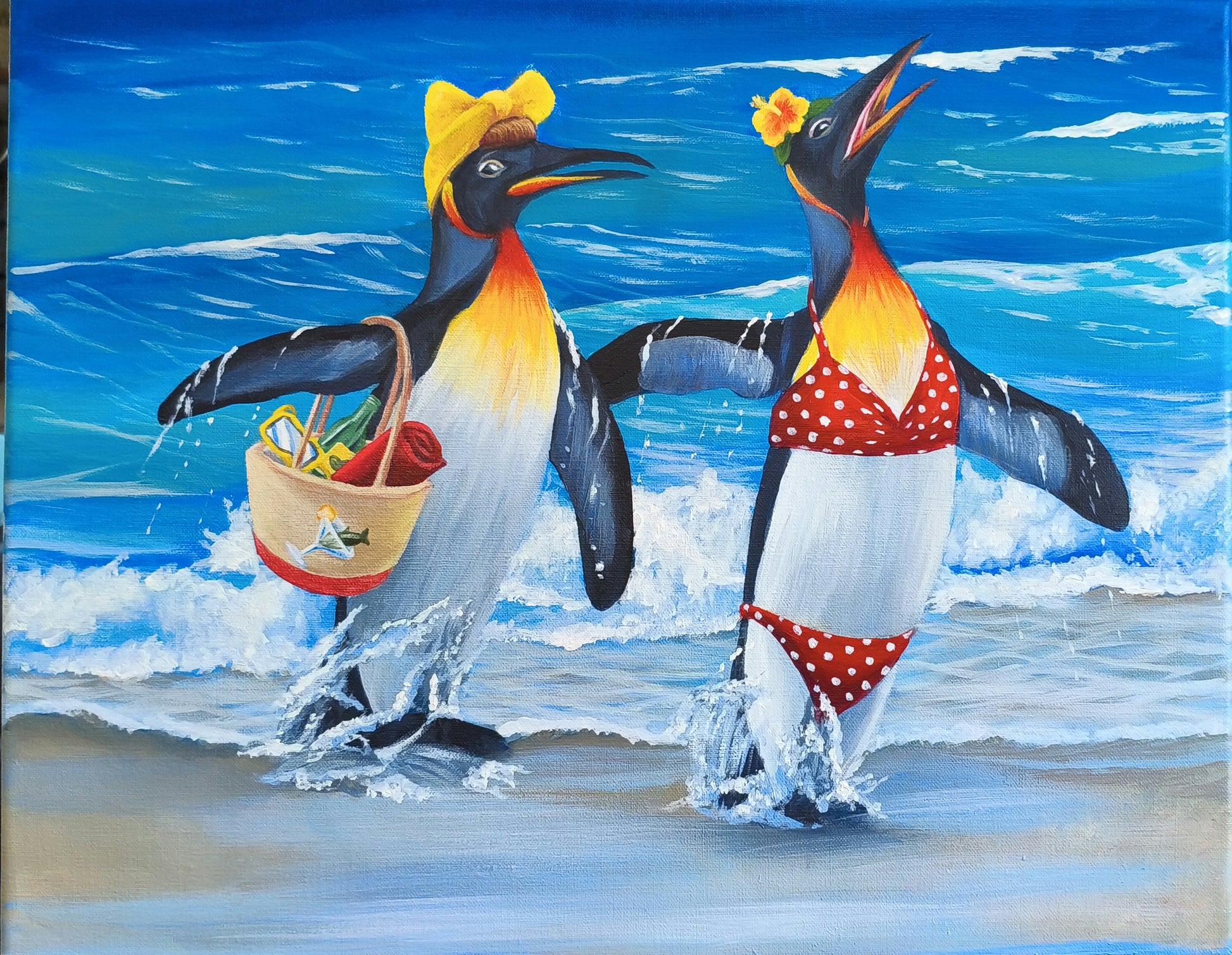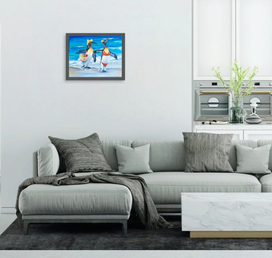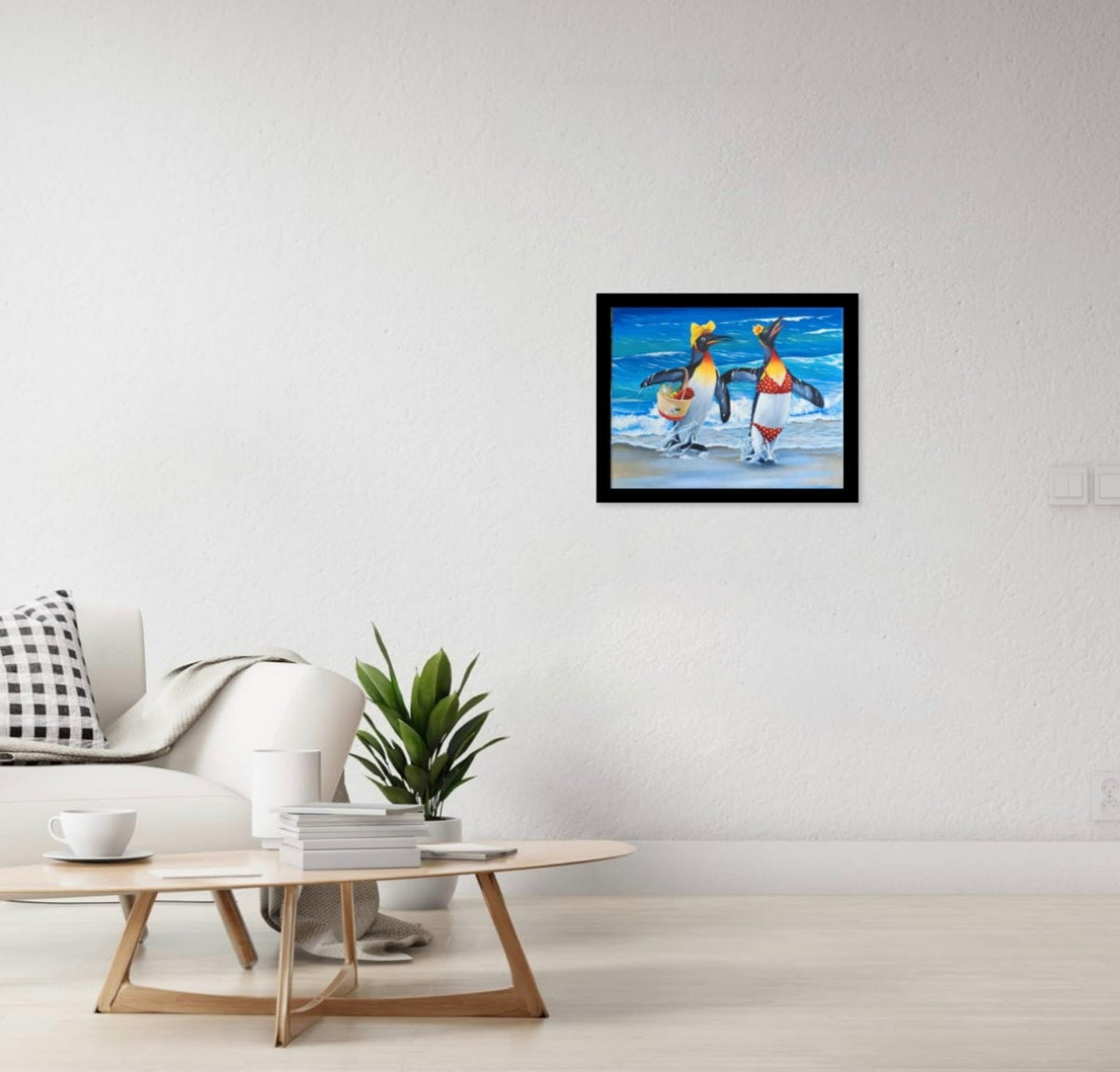 Two penguins on a sun-soaked beach, dressed for the bar rather than the ice. I’m drawn to animals that remind us of ourselves — a tilt of the head, a knowing glance — and I like pairing that with unexpected settings. This one’s about friendship, leisure, and a bit of holiday mischief. The humour is there to make you smile, but the detail is there to make you look twice.