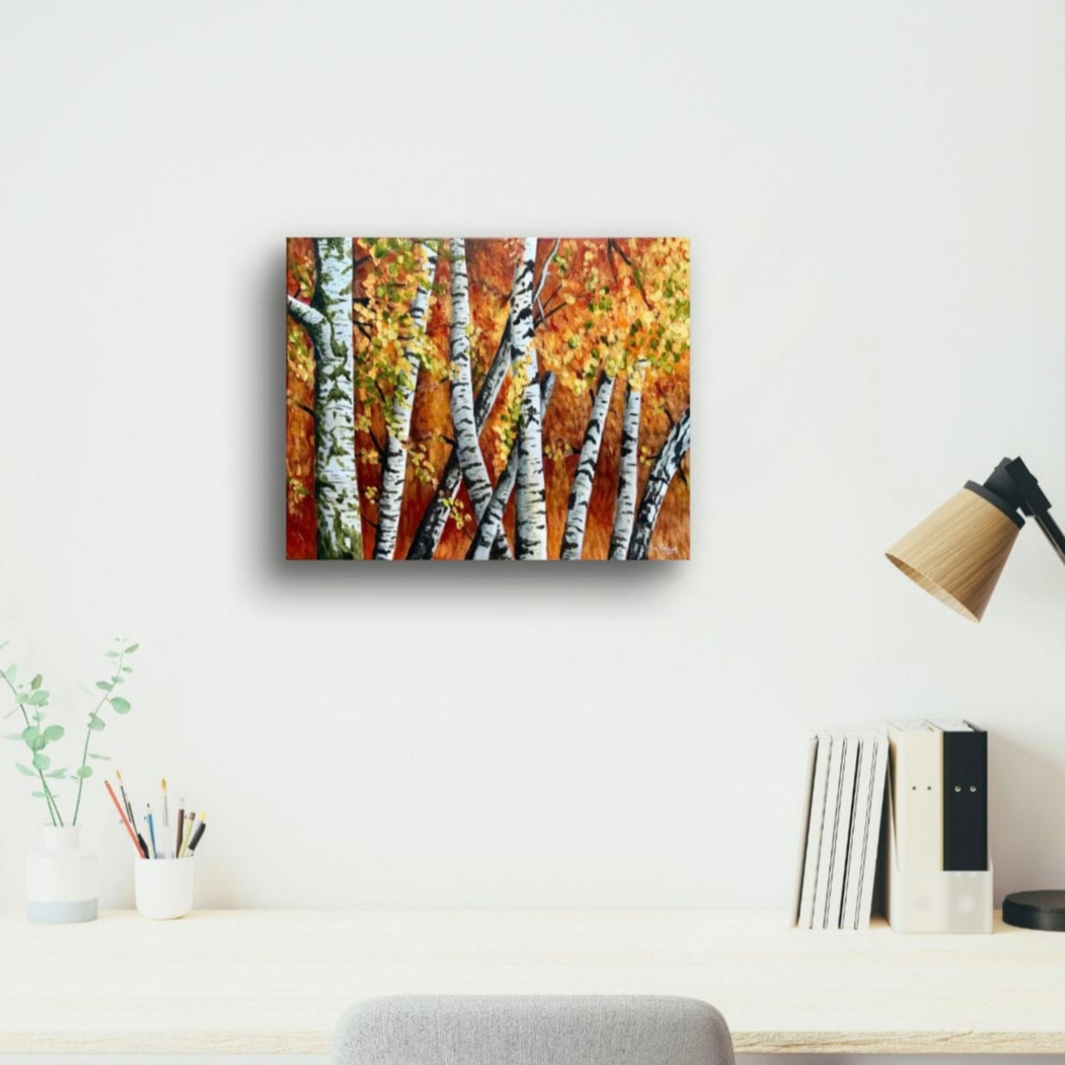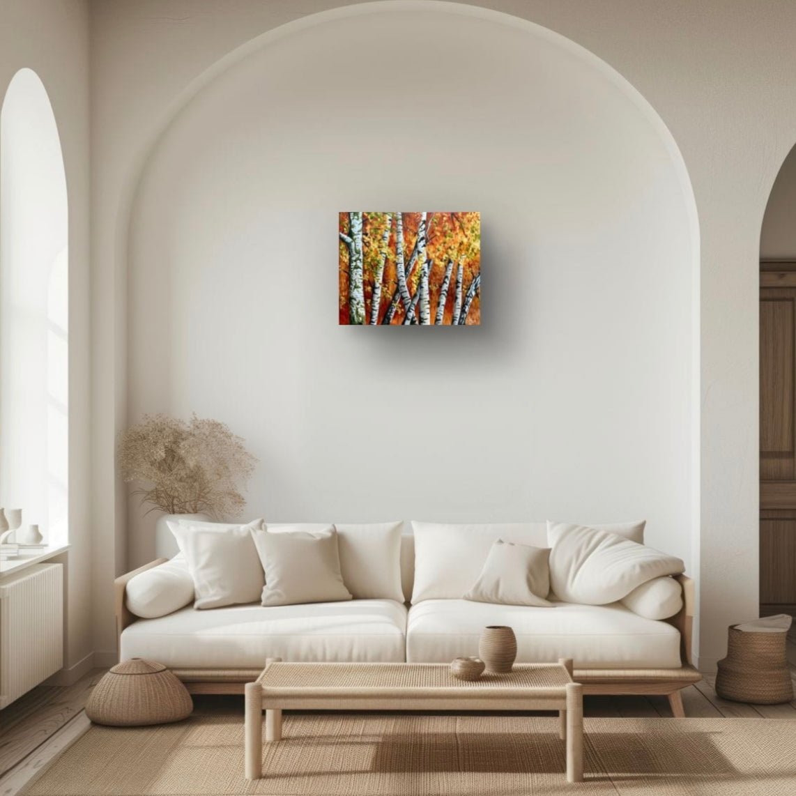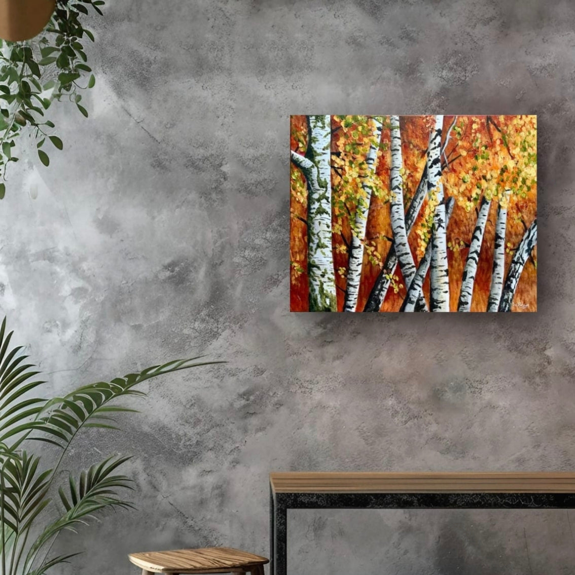 I painted Fiery Birches to capture that fleeting blaze, when the leaves turn brilliant gold, orange and crimson against the cool silver bark. It’s a scene that always stops me in my tracks on autumn walks — nature’s last, bold show before the quiet of winter sets in.