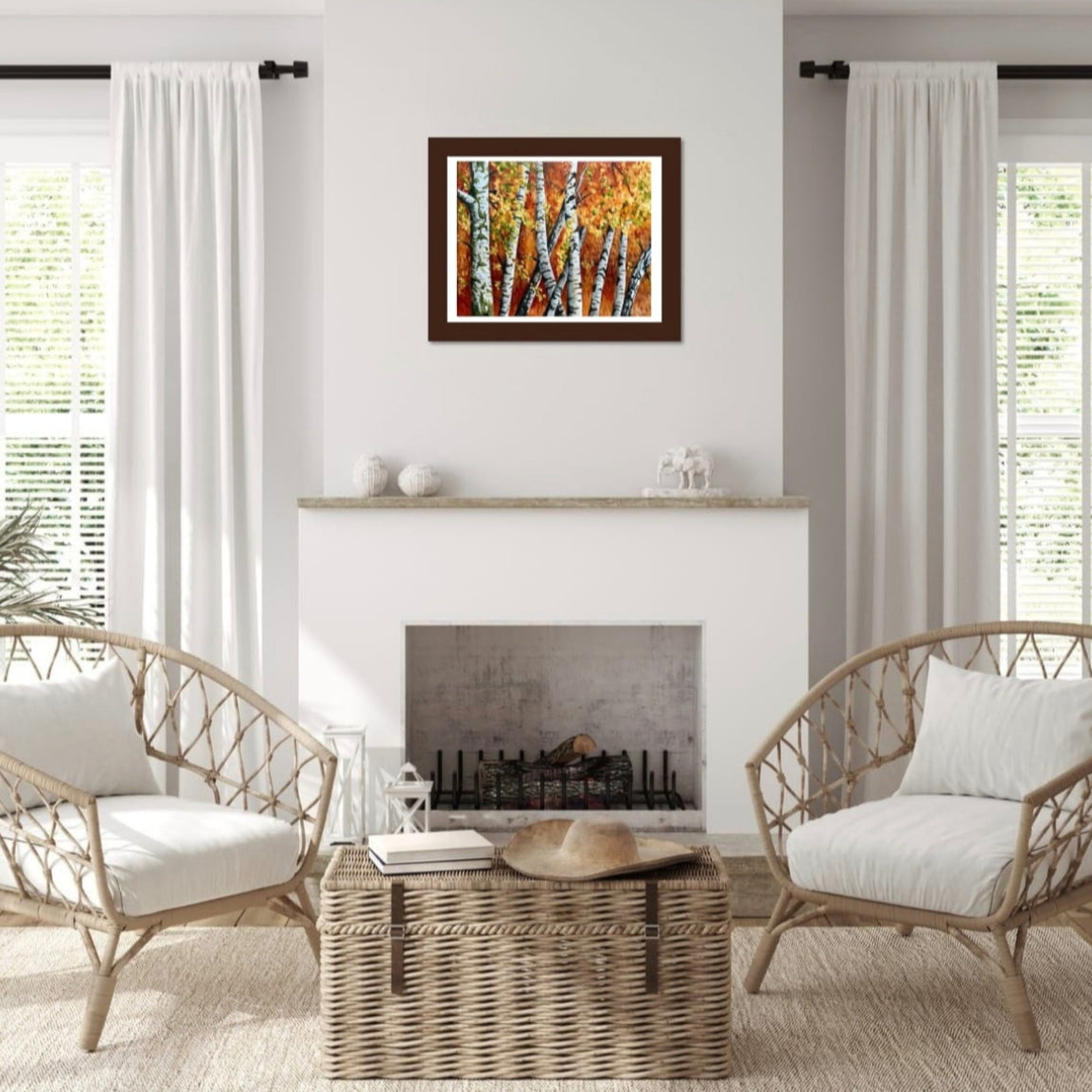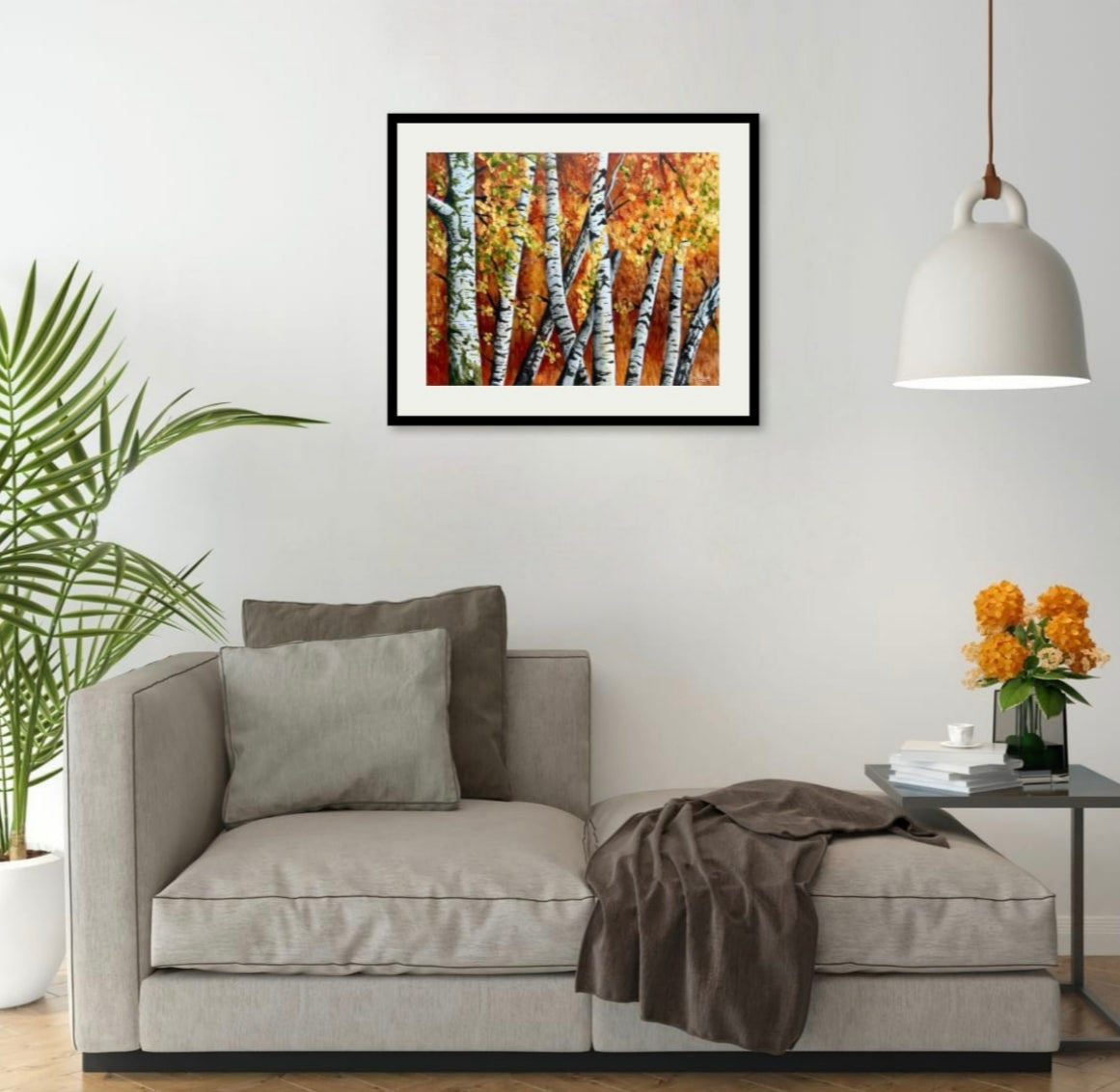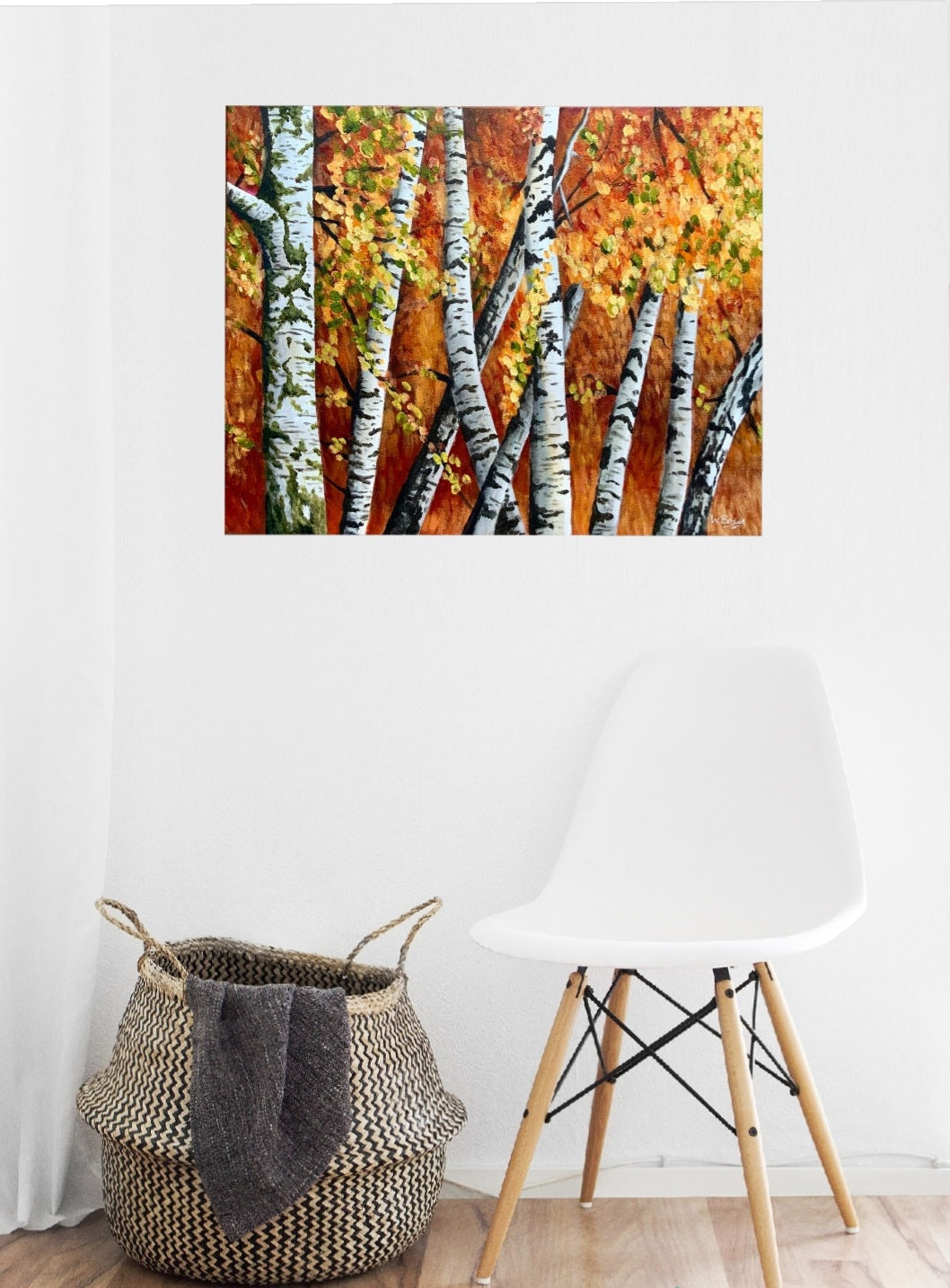 I painted Fiery Birches to capture that fleeting blaze, when the leaves turn brilliant gold, orange and crimson against the cool silver bark. It’s a scene that always stops me in my tracks on autumn walks — nature’s last, bold show before the quiet of winter sets in.