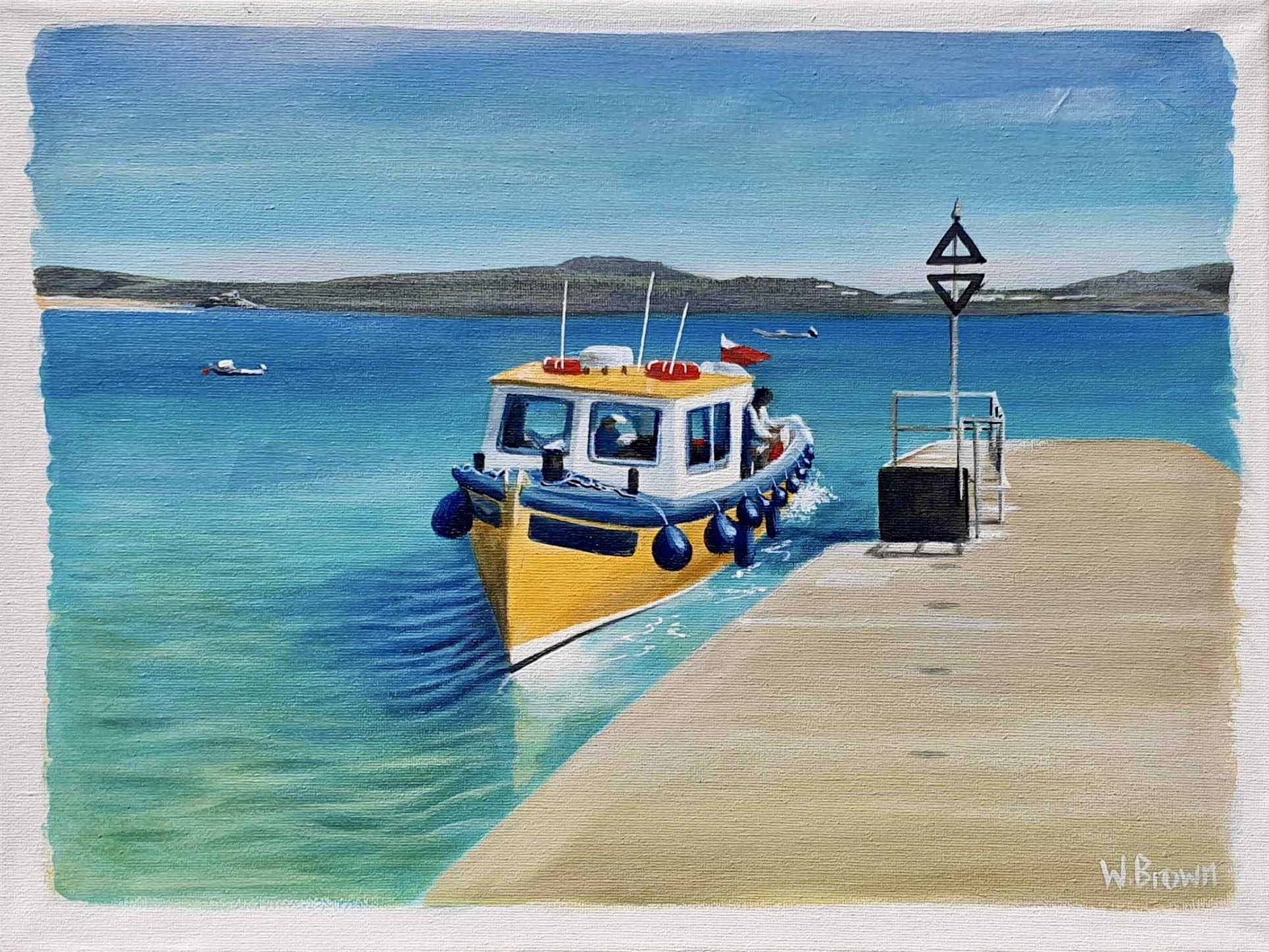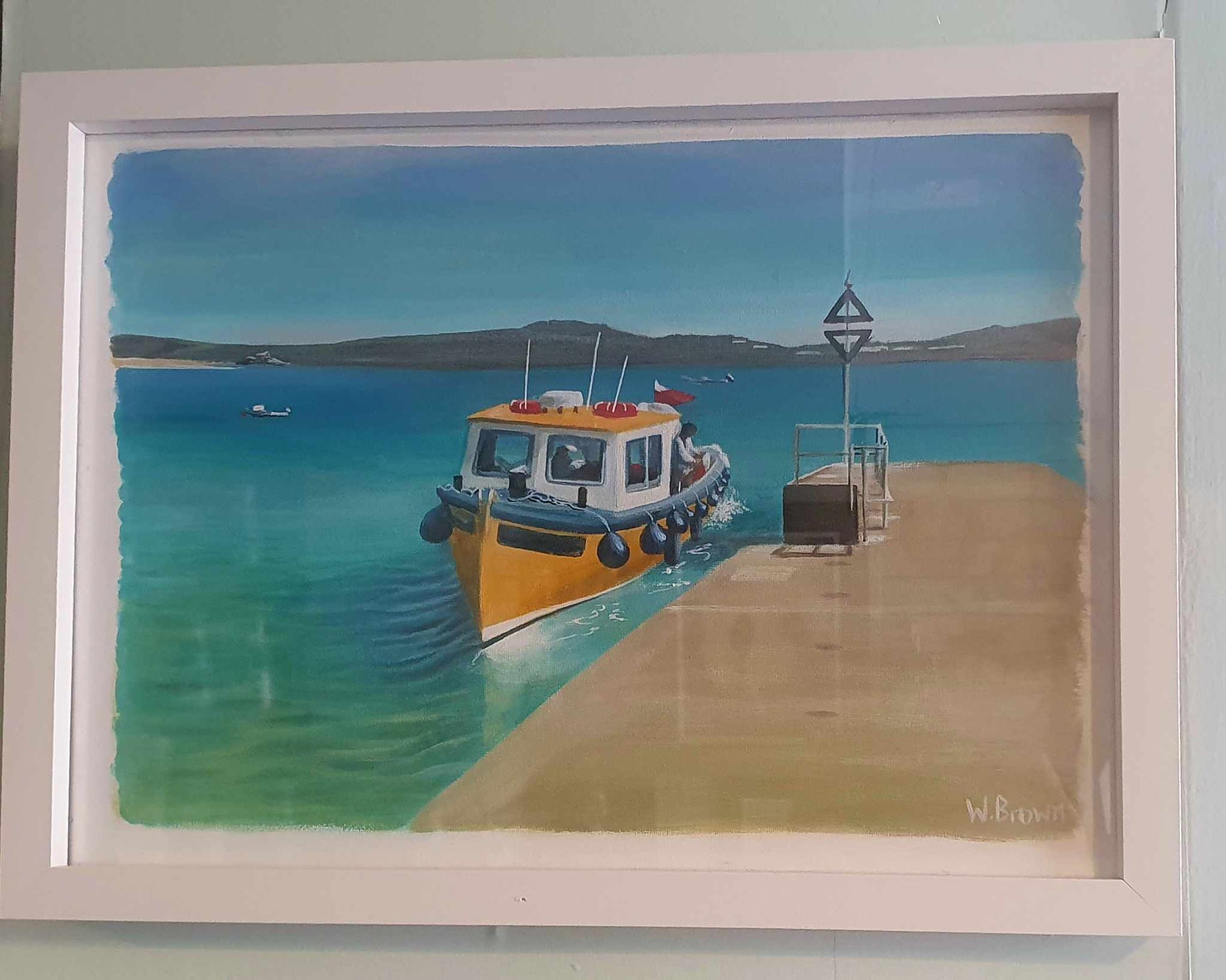 This painting shows Golden Spray, a well-known passenger boat approaching Church Quay on Bryher. It’s a personal piece for me — my own brother once crewed on this very boat, taking tourists and locals on excursions around the stunning archipelago. I’ve tried to capture not just the scene but the feeling of those bright island mornings, full of promise and adventure.