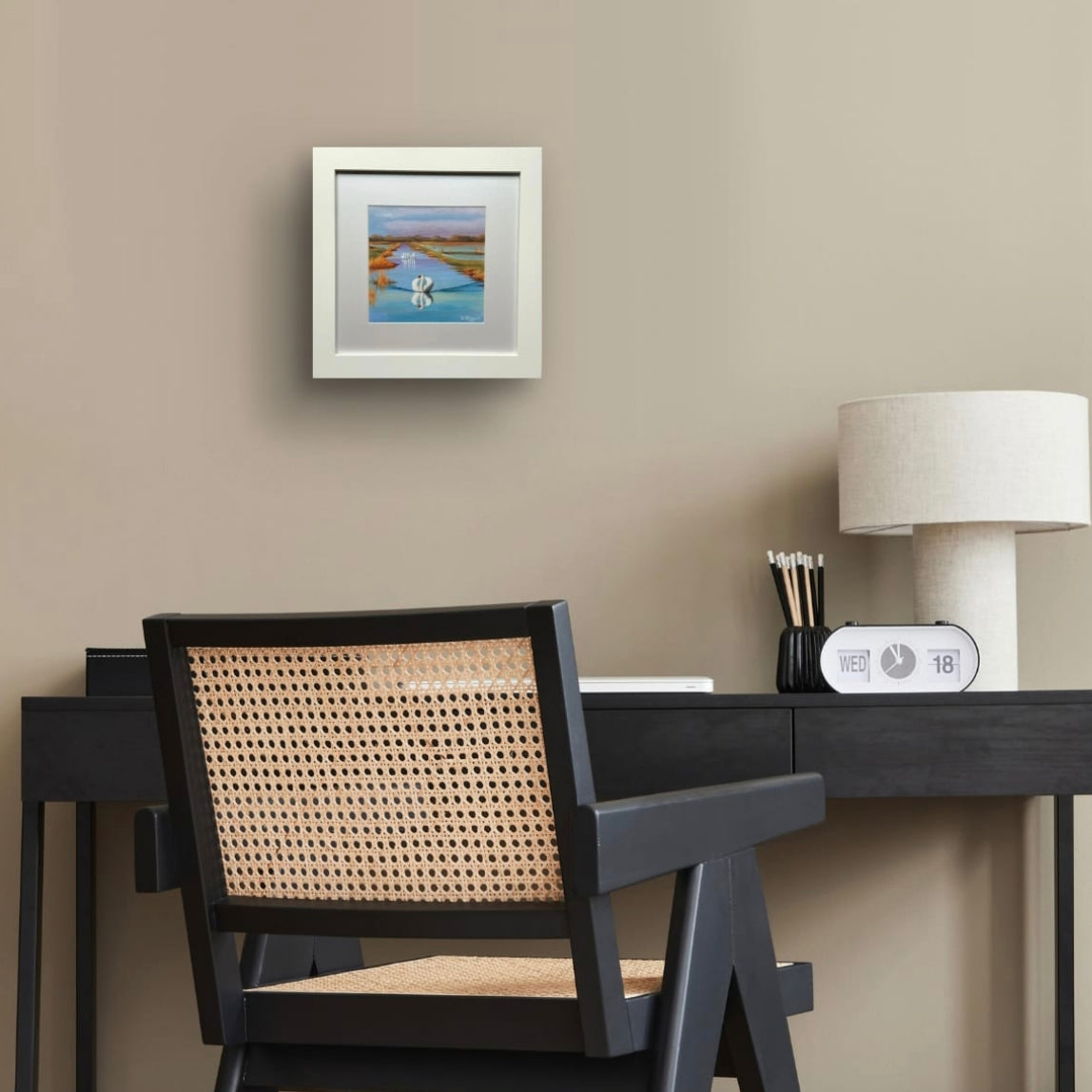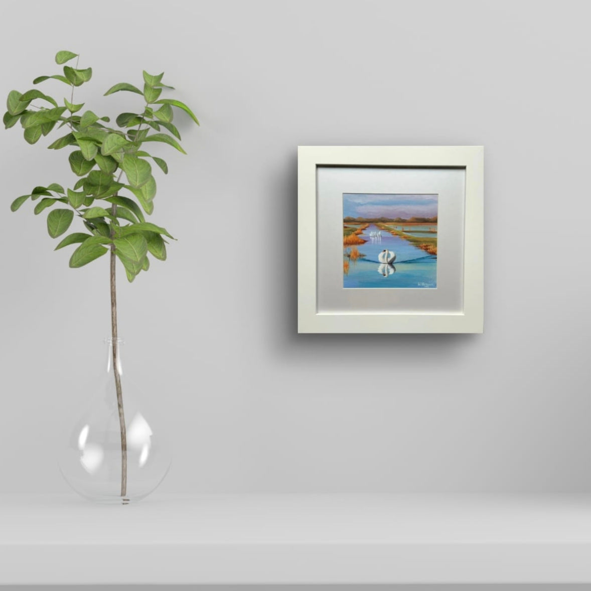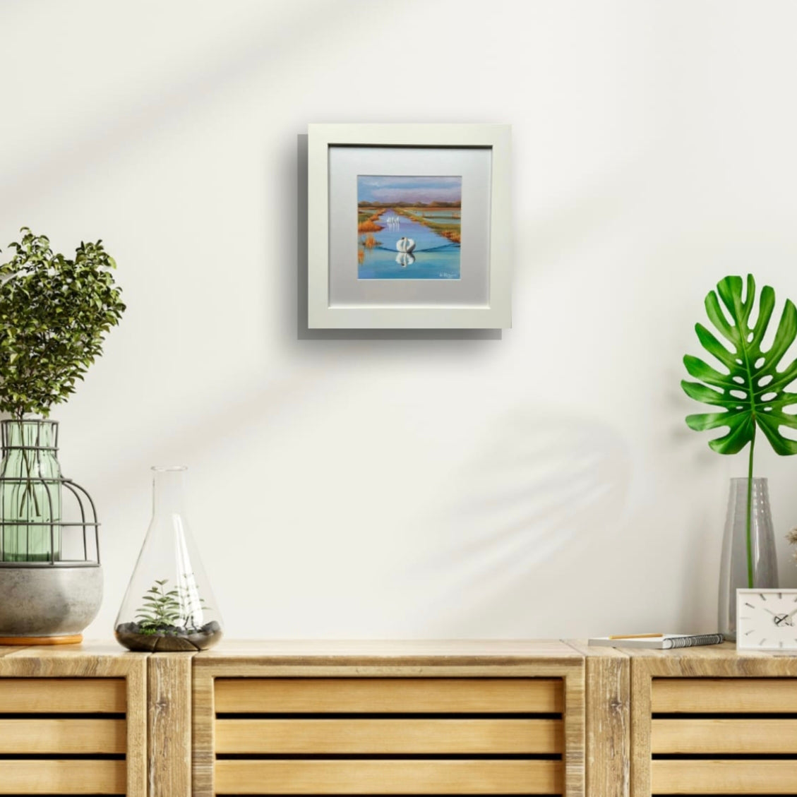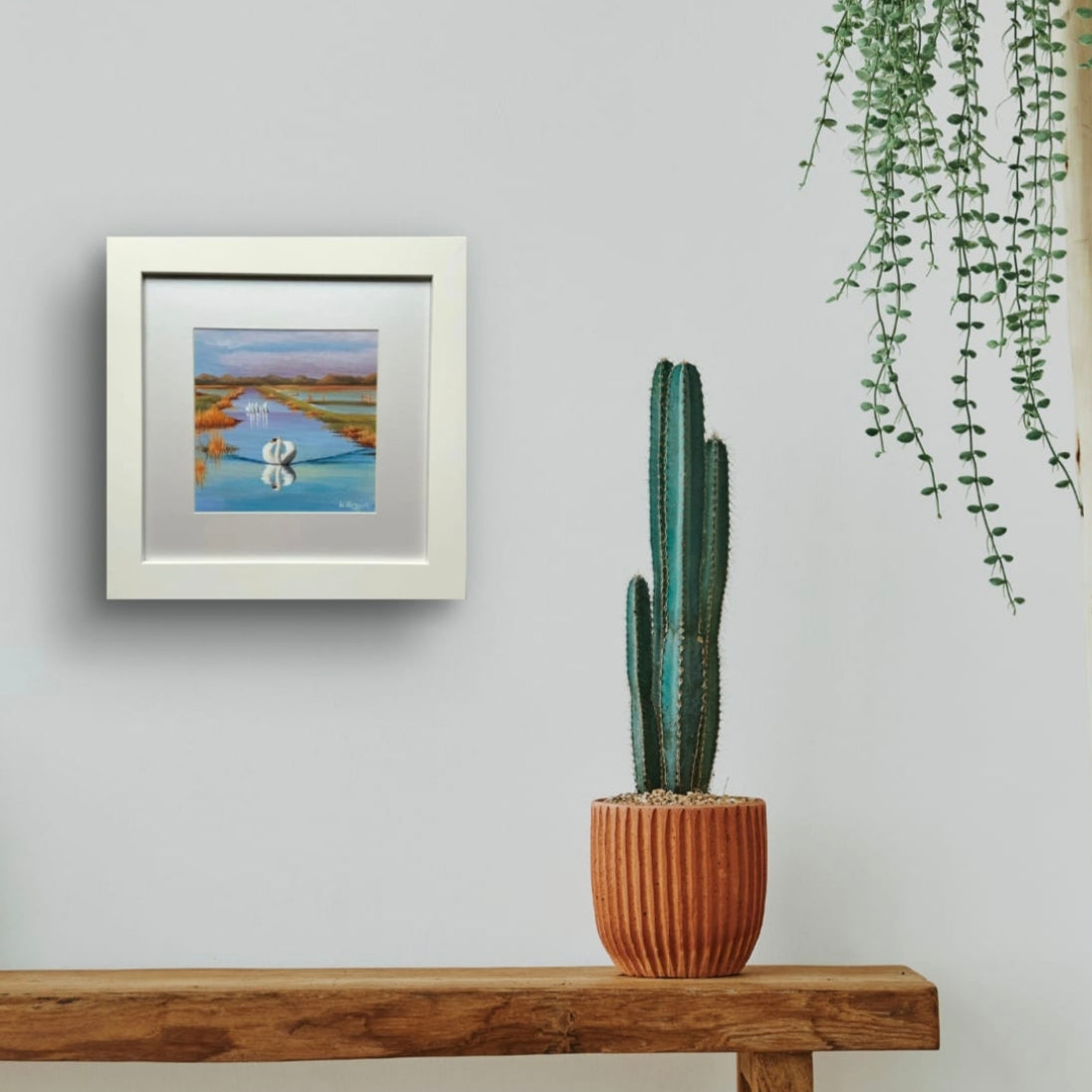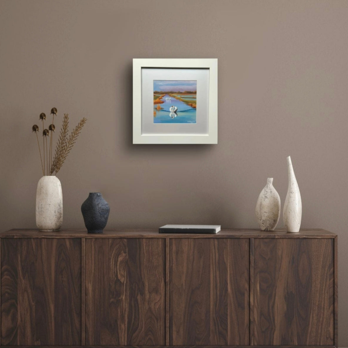 A serene scene from the Somerset Levels, where still floodwaters mirror a graceful swan gliding ahead of its bevy. Painted in rich, natural tones with crisp reflections and gentle movement, this piece captures a quiet moment of calm and quiet confidence in the marshland landscape.