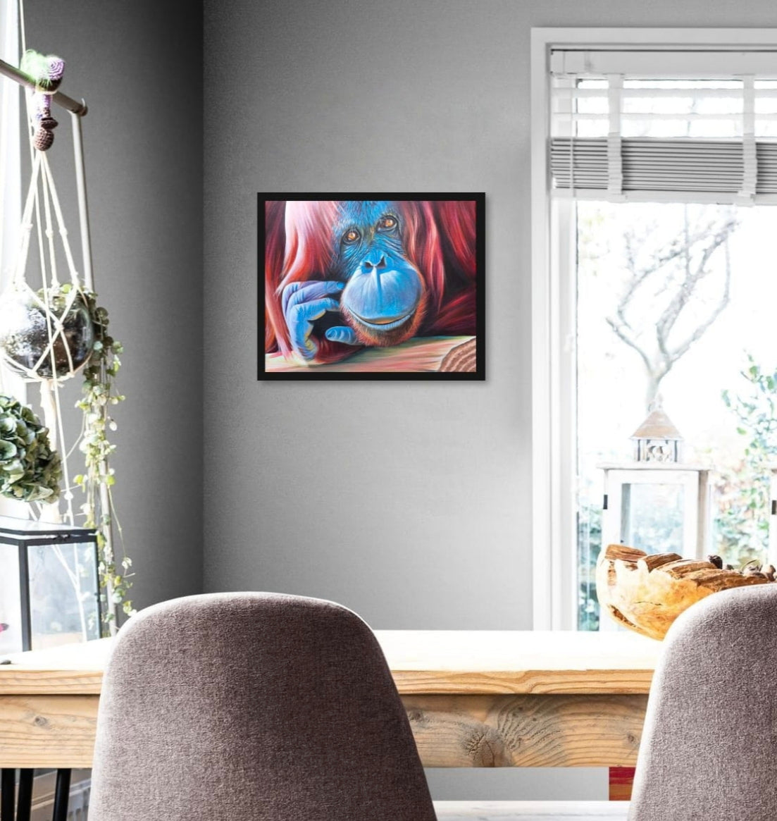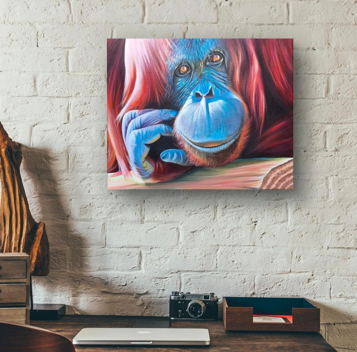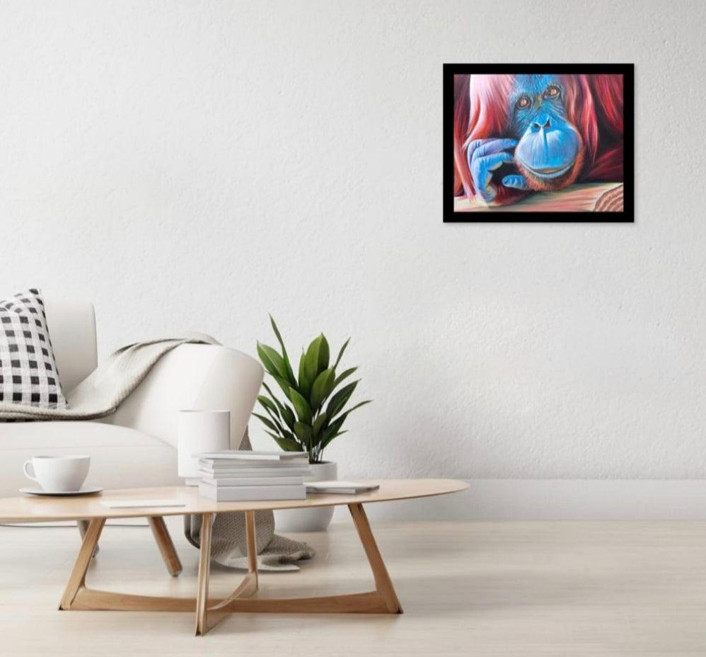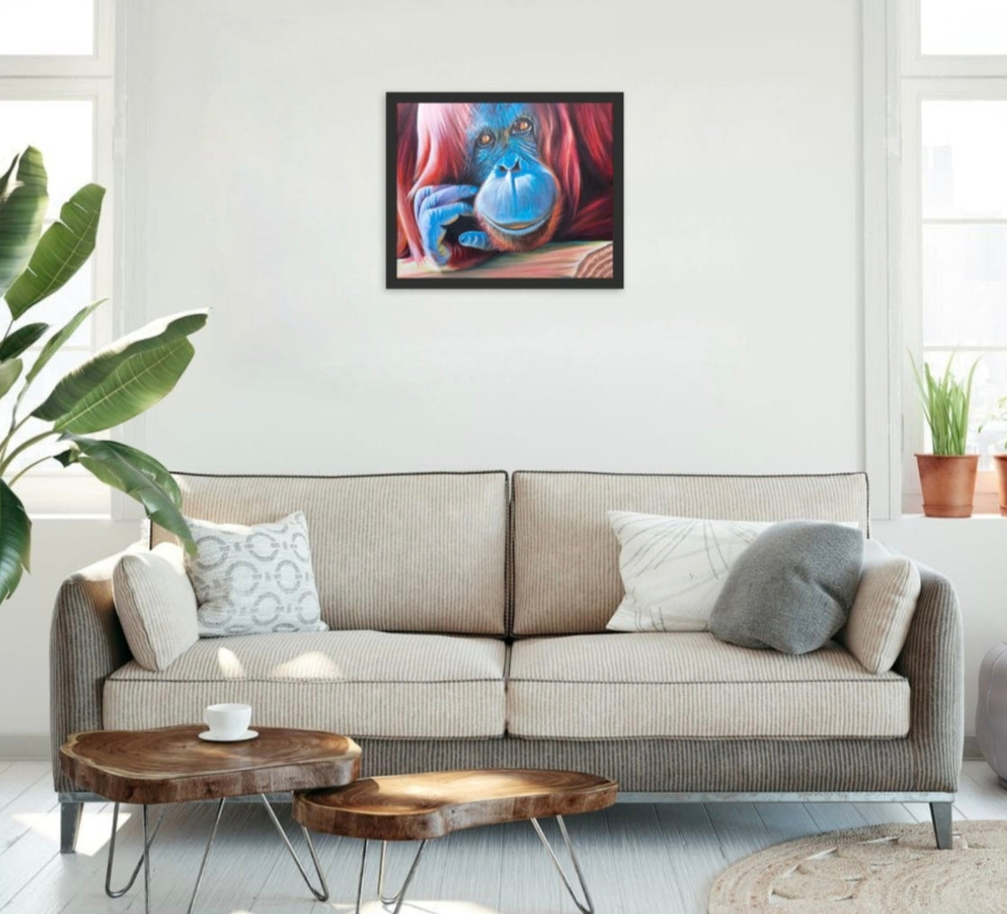 The name orangutan comes from the Malay orang hutan, meaning person of the forest. It’s a fitting description: their eyes are warm and humanlike, their presence full of quiet thought. In this painting, layered reds and vivid blues bring depth and life to the fur, while the pensive gaze holds you still.